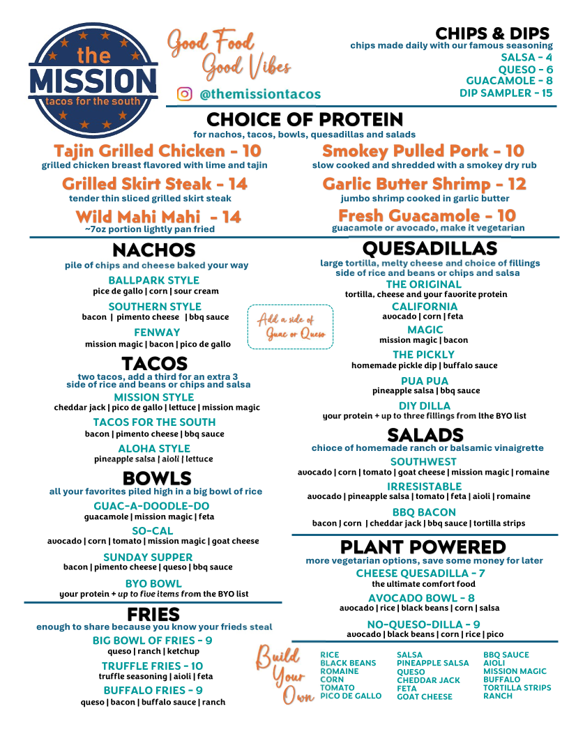 Welcome to The Mission - Tacos for the South, a vibrant culinary destination located at 961 Burlington Ave, Gibsonville, NC. This unique eatery specializes in bold flavors and innovative twists on classic Mexican dishes. The menu offers a tantalizing range of options, from Chips and Dips like guacamole served with homemade chips to hearty Quesadillas featuring fresh ingredients and a variety of proteins.